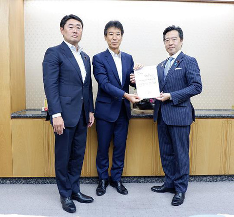 瀬戸隆一大臣政務官に要望書を手渡すおのせ会長(左)、鈴木副会長(右)